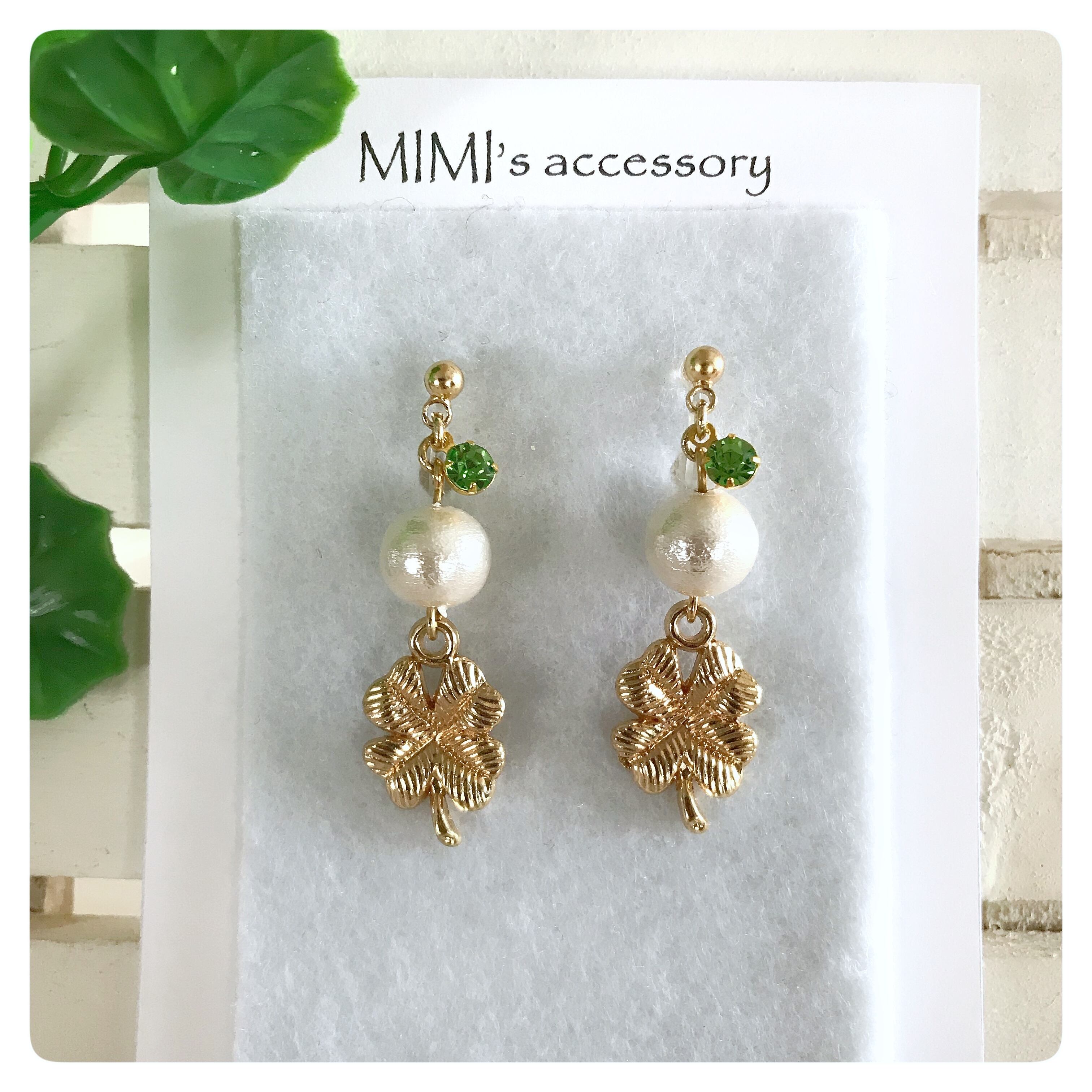 四つ葉のクローバーとコットンパール ノンホールピアス