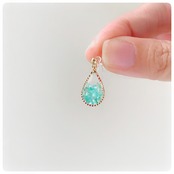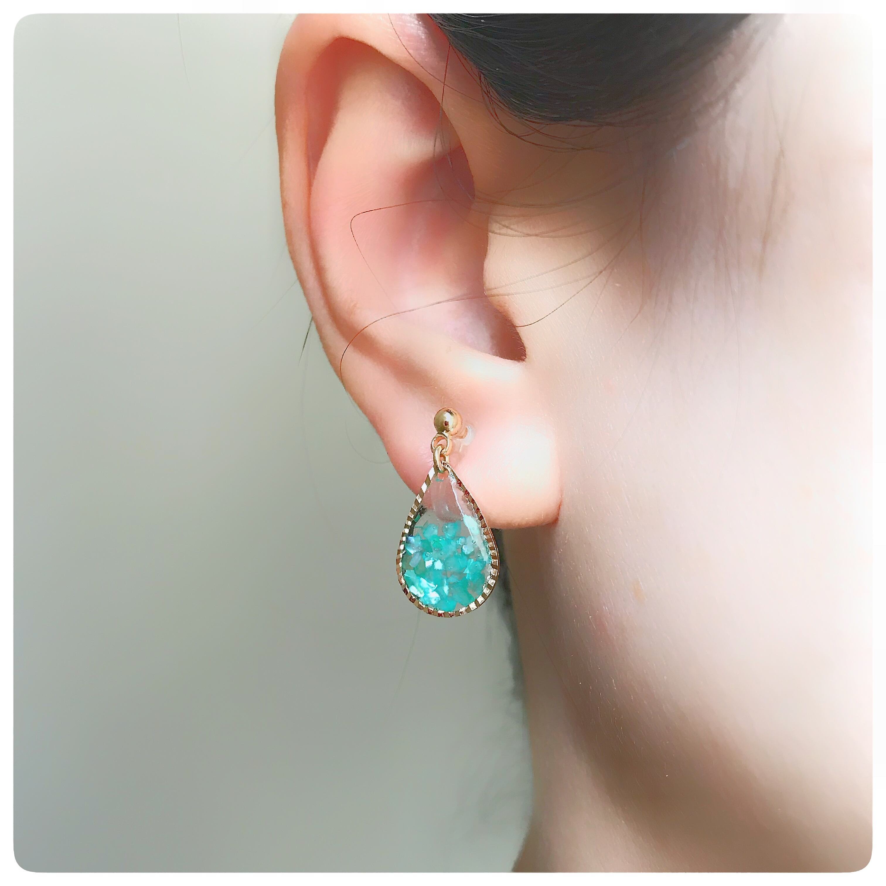 ターコイズブルーのクラッシュシェルを雫型のフープにレジンで閉じ込めました。